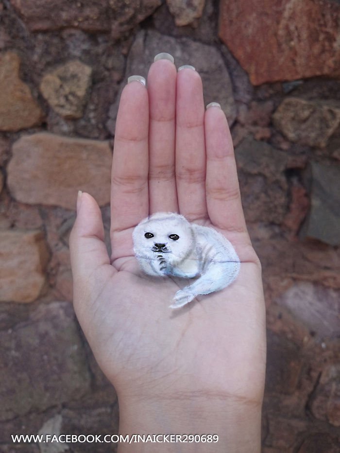 Az egyik kedvencem a többiek közül Iantha Naicker, aki állatokat, 3D-s képeket készít a tenyerére.