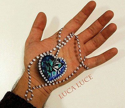 És végül, de nem utolsó sorban nem mehetünk el Luca Luce munkássága mellett sem, aki eredeti szakmáját tekintve maszkmester, így nem csak tenyérre készít hihetetlen alkotásokat, de body art is fent van a listámon, így arról a műveiről majd később ejtek szót. Most két gyöngyszem a tenyérre alkotott festményeiből: